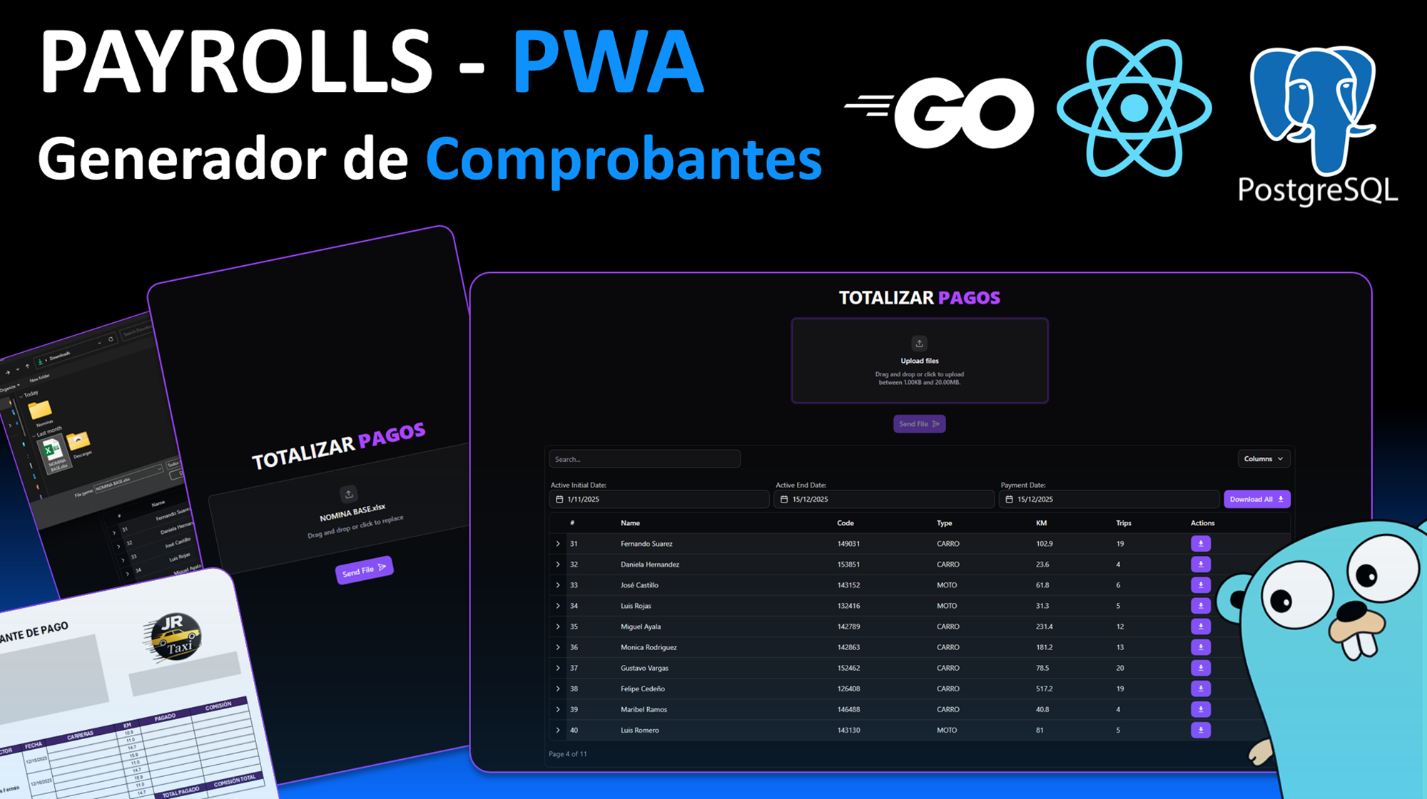 La Solución: Microservicio en Go para parsing concurrente y validación estricta de datos. Incluye una PWA para la gestión y emisión de comprobantes PDFs legales.